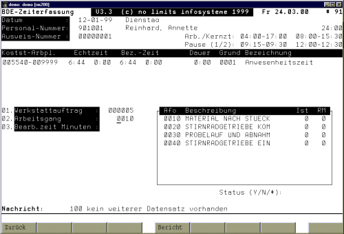 2.0 Zeiterfassung Nach Anwahl der BDE-Rückmeldung wird der aktuelle Buchungstag angezeigt und der Benutzer zur Eingabe einer Ausweisnummer aufgefordert. Wahlweise ist das System so parametrierbar, dass sich der Benutzer auch durch Eingabe seiner Personalnummer identifizieren kann. Auch eine Matchcode-Funktion ist nutzbar. Soll eine Buchung für einen vorhergehenden Tag erfolgen, kann über die Zurück Funktion ein neues Datum eingegeben werden. Danach werden für den ausgewählten Mitarbeiter und den Tag die Sollzeiten und die tatsächlichen Anwesenheitszeiten angezeigt.