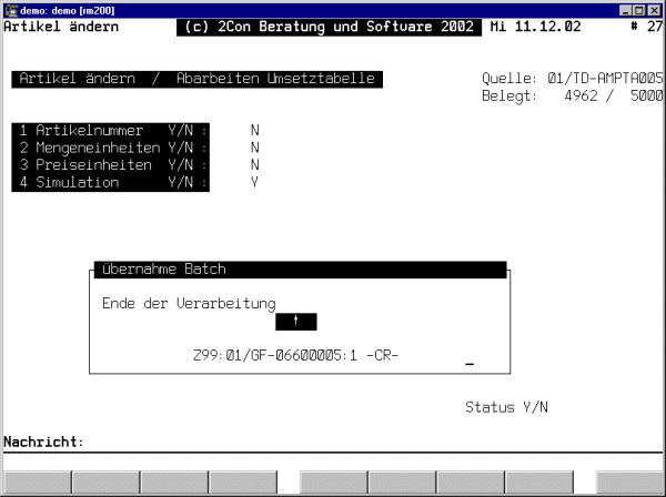 In einem Batchlauf werden dann alle betreffenden Dateien abgearbeitet, und, wenn ein Artikel in der Arbeitsdatei eingetragen ist, wird dieser umgestellt. Im Anhang finden Sie eine Liste der zu bearbeitenden Dateien. Non-Standard oder Statistikdateien der COMET® FIBU werden nicht bearbeitet. Hierfür gibt es vorbereitete Routinen, die individuell nachbearbeitet werden müssen.
