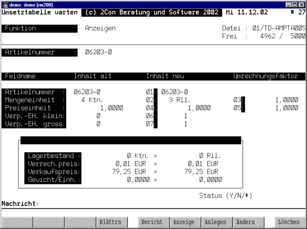 Mit diesem Programm können Sie Artikel zusätzlich in der Umsetztabelle Anlegen, übernommene Artikel Ändern oder Löschen . In einem Anzeigefenster sehen Sie, wie sich die Änderung von Mengen- und Preiseinheit bzw. den zugehörigen Faktoren auswirken würde. Als exemplarische Werte sehen Sie den Bestand den Verrechnungspreis und den Verkaufspreis.